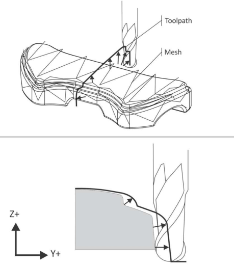 نرمافزار CAD/CAM، مسیرابزارهای سهبعدی را به وسیله مثلثیسازی مدل به عنوان مرحله اول ایجاد میکند؛ همانطور که در شکل 1 نشان داده شده است (شبکیه اصلی، بسیار بهتر از مورد نشان داده شده است). این شبکیه، برای محاسبه مسیرابزار برپایه انداره و فرم ابزار استفاده میشود.