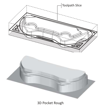 سیستمهای CAM، استراتژیهای بسیاری برای خشنکاری دارند که رایجترین موارد، انواعی از حفرهکاری سهبعدی است. این مسیرابزارها به وسیله ورقهکاری قطعه با صفحات عمود بر محور z کار میکنند. در هر ارتفاع، یک مرز، افست آزادی قطعه و مسیرابزار حفره دوبعدی تولیدشده از این مرز ایجاد میشود. حاصل این کار، یک فرم کیکی چندارتفاعی است که در شکل 5 نشان داده شده است.